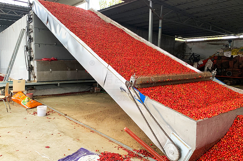 1、辣椒通過上料輸送機(jī)進(jìn)入烘干機(jī)主機(jī),通過勻料裝置將辣椒均勻鋪在網(wǎng)帶上。