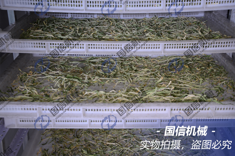 當蔬菜水分蒸發(fā)率達到50-60%左右時,游離水很大程度的減少,這個時候蔬菜內(nèi)部水分擴散速度減慢,此其表面的水分汽化還慢,這個階段稱蔬菜的減速階段,隨著水分的進一步蒸發(fā),烘干室的溫度也逐漸升高,使水含量達到一個平衡含水率,物料水分含水量在15%左右,烘干時間為8-15 個小時,干燥完成,這時達到烘干的優(yōu)質(zhì)效果。