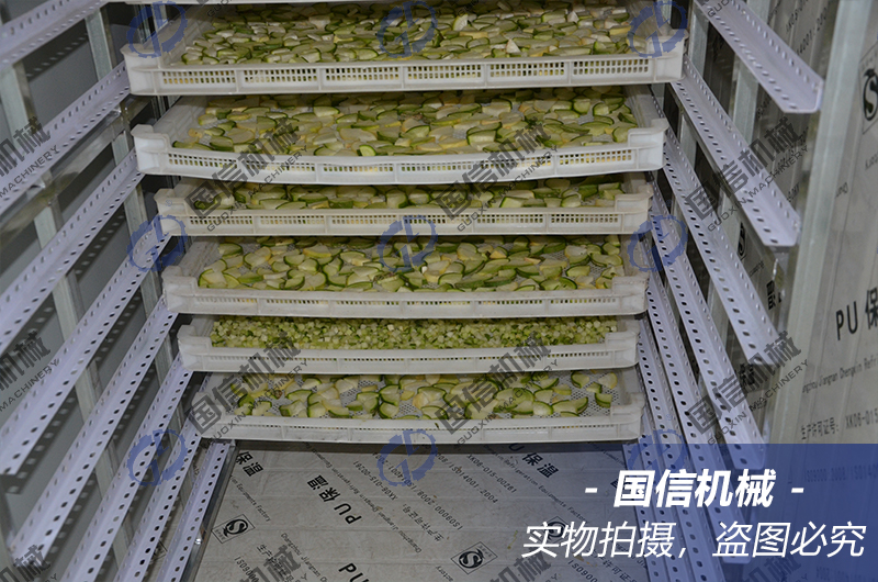 首先將溫度設置到43-48℃,濕度保持53℃,時間1-2小時,它使蔬菜表面的水分吸收能量變?yōu)樗魵夂蟠罅克舭l(fā)出去。當熱氣流速越快,溫度越低,而烘干房相對濕度越小,同時含水率下降,干燥速度加快。