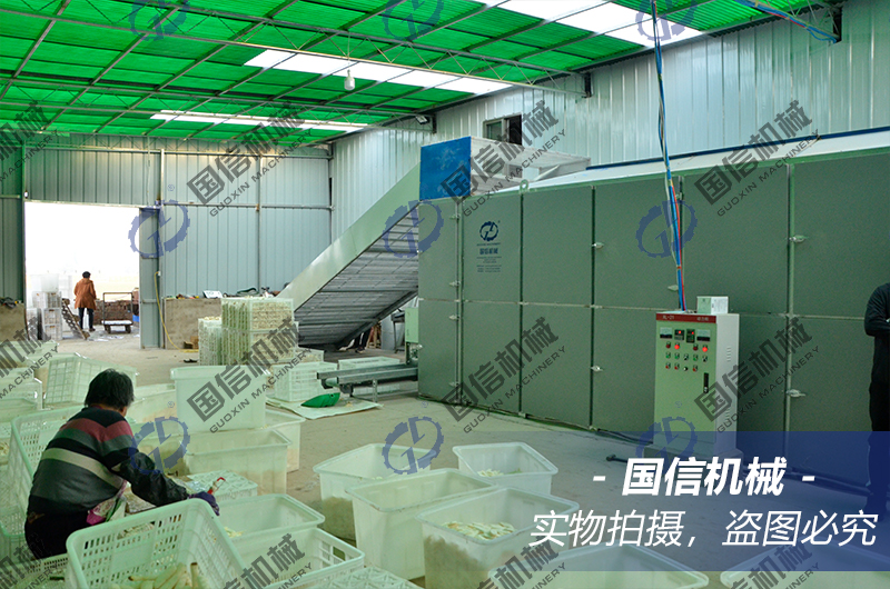 二、烘干的方式 山藥烘干使用的是流水線網(wǎng)帶式烘干,烘干方式是動態(tài)烘干,通過網(wǎng)帶式烘干機的幾層不銹鋼網(wǎng)帶不停翻轉(zhuǎn),實現(xiàn)對山藥的烘干。熱源一般使用的是燃燒型或者空氣能熱泵,熱量從底部進(jìn)入烘干機內(nèi)對山藥進(jìn)行烘干,烘干過程中排出的水分從機器頂部的排濕口排出。我們在烘干山藥時,主要選擇的設(shè)備就是網(wǎng)帶式烘干機,選擇這種設(shè)備的好處是:一、網(wǎng)帶烘干機的產(chǎn)量比較大,每天的處理量可以從2噸到50噸不等。二、烘干時間短,因為網(wǎng)帶烘干機是動態(tài)烘干,山藥在設(shè)備中不停翻轉(zhuǎn),所以受熱速度比較快,加熱比較均勻,烘干時間可以縮短幾個小時。