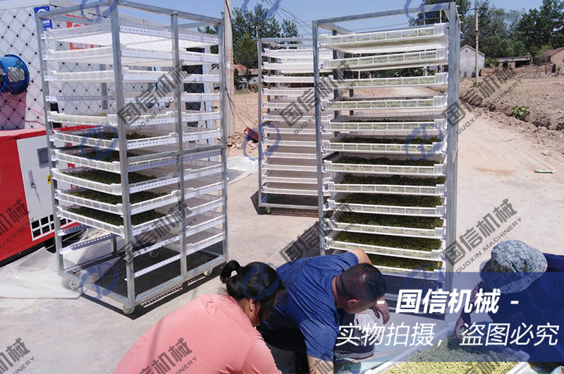 將采摘后的金銀花均勻的平鋪在托盤上,可以用噴淋裝置對金銀花噴灑少量的水,然后放置于小推車送入烘干房,設置溫度65~70℃,待溫度穩(wěn)定后,時間保持1.5~2小時即可完成殺青階段,此階段是金銀花烘干工藝的重要階段,決定了成品干貨的色澤。