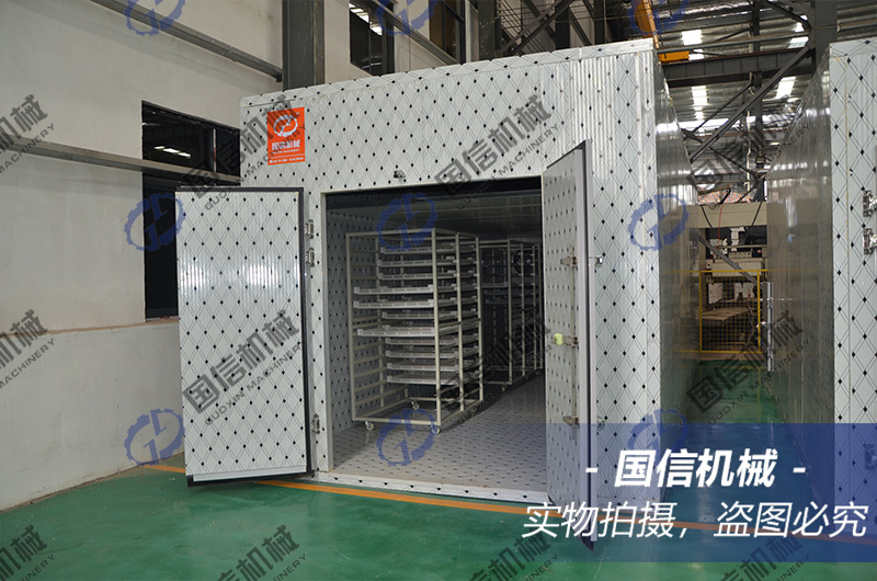 板鴨烘干工藝以及板鴨烘干機(jī)使用方法:將擦干之鴨體加以整型,將其掛入竹杠上,放入空氣能板鴨烘干房。以空氣能板鴨烘干機(jī)為例設(shè)置烘干參數(shù),首先45~50℃熱風(fēng)干燥約6小時(shí)后,移置于約15℃冷風(fēng)處冷卻5~8小時(shí),使鴨體定型,并可使皮膚出現(xiàn)乳白色,如用一次烘干時(shí),則皮膚易變暗褐色,外觀不良。冷卻后之鴨只再以45~50℃熱風(fēng)干燥。
