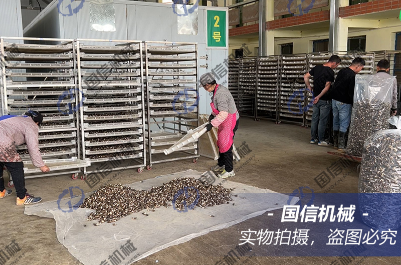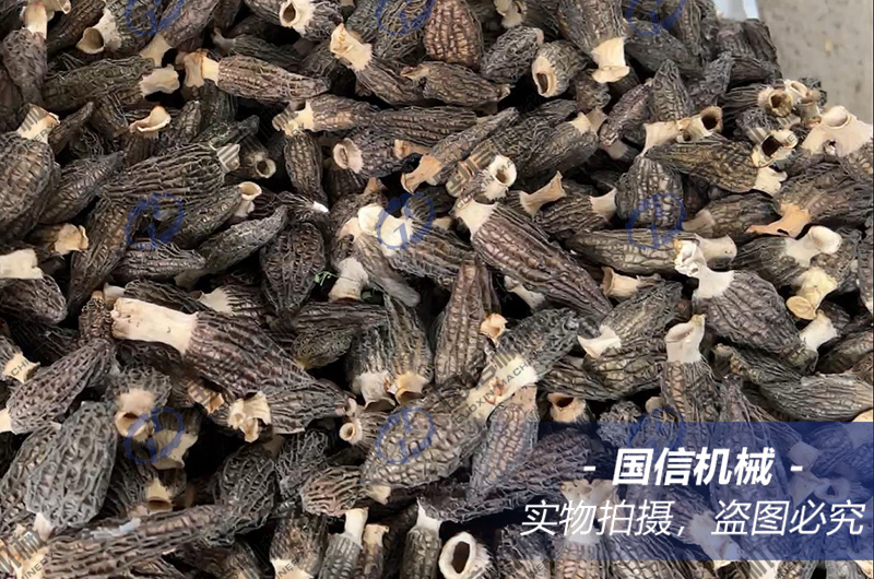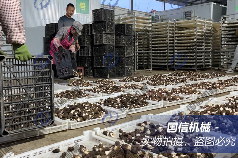 羊肚菌水分含量非常高,在烘干過中要特別注重溫度與濕度的控制。而且不同批次采收的羊肚菌其水分含量不一樣。一般來說,第一茬菇的含水量相對低,陸續(xù)第二茬菇、第三茬菇的含水量一批批加大,都可以在第一茬菇烘干經驗的基礎上適當加長時間。這里以第一茬菇的烘干為例,介紹羊肚菌的烘干經驗: