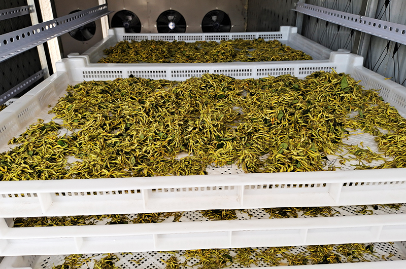 第四階段:強(qiáng)制烘干:溫度范圍為55~65攝氏度,溫度不得超過70攝氏度的高溫,適當(dāng)?shù)慕档团艥袼俣?,?jīng)過2~4小時(shí)的強(qiáng)制烘干,在觀察孔觀察金銀花的烘干成色后可以停機(jī)出爐。
