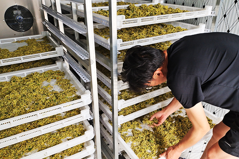 第二階段:烘干房溫度逐漸從41攝氏度提升至48攝氏度,此溫差的提升時(shí)間掌控在5~7個(gè)小時(shí)逐漸完成,一定不可超過50攝氏度的溫度范圍,同時(shí)保持同樣的排濕速度;金銀花經(jīng)過9~13個(gè)小時(shí)的初始、中度烘干和強(qiáng)排濕基本達(dá)到5成干燥;