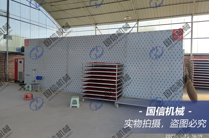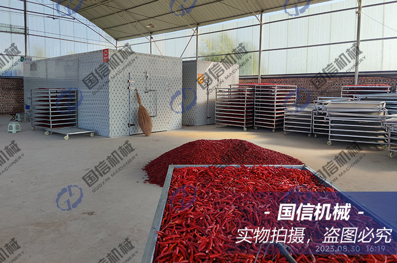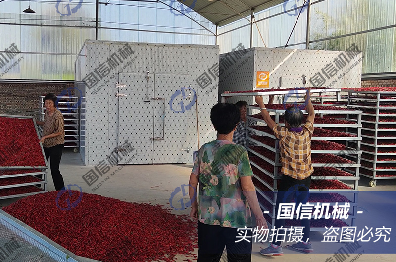辣椒送入烘干房內(nèi)迅速升溫至50℃左右,使辣椒快速接觸到熱風(fēng)發(fā)汽,加強(qiáng)排濕,保證顏色品質(zhì),不給辣椒熟化轉(zhuǎn)變時間,至辣椒表面干燥縮水,濕度控制在50%左右,時間保持在10-20個小時。