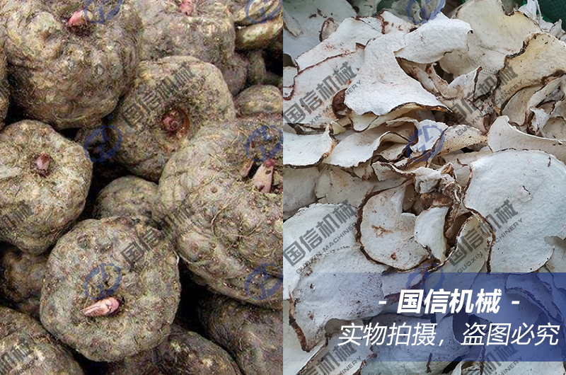 魔芋去皮后,用切片機(jī)切成所需的片、條進(jìn)行干燥。
